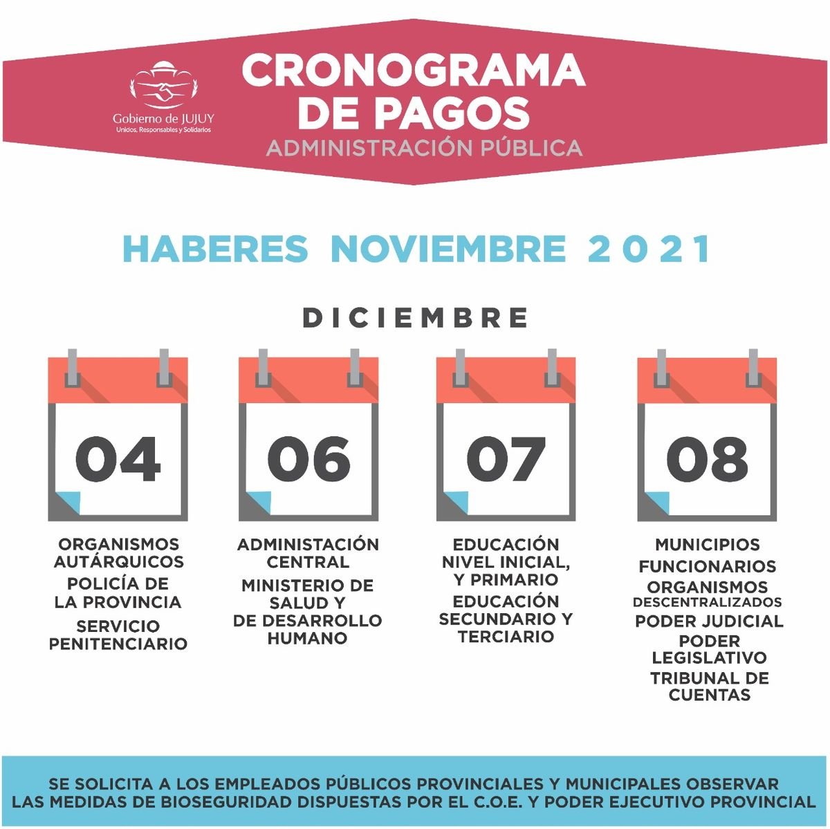Finalmente, el día miércoles 8, percibirán sus haberes Municipios, Funcionarios, Organismos Descentralizados, Poder Judicial, Poder Legislativo y Tribunal de Cuentas. Desde el organismo provincial se remarcó la necesidad de mantener las medidas sanitarias correspondientes a la hora de utilizar los cajeros de pago; el uso obligatorio de barbijos, la distancia social y del alcohol en gel.