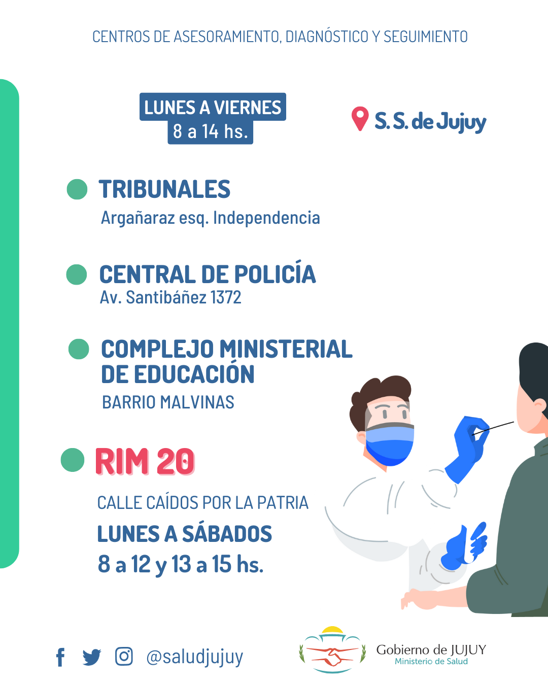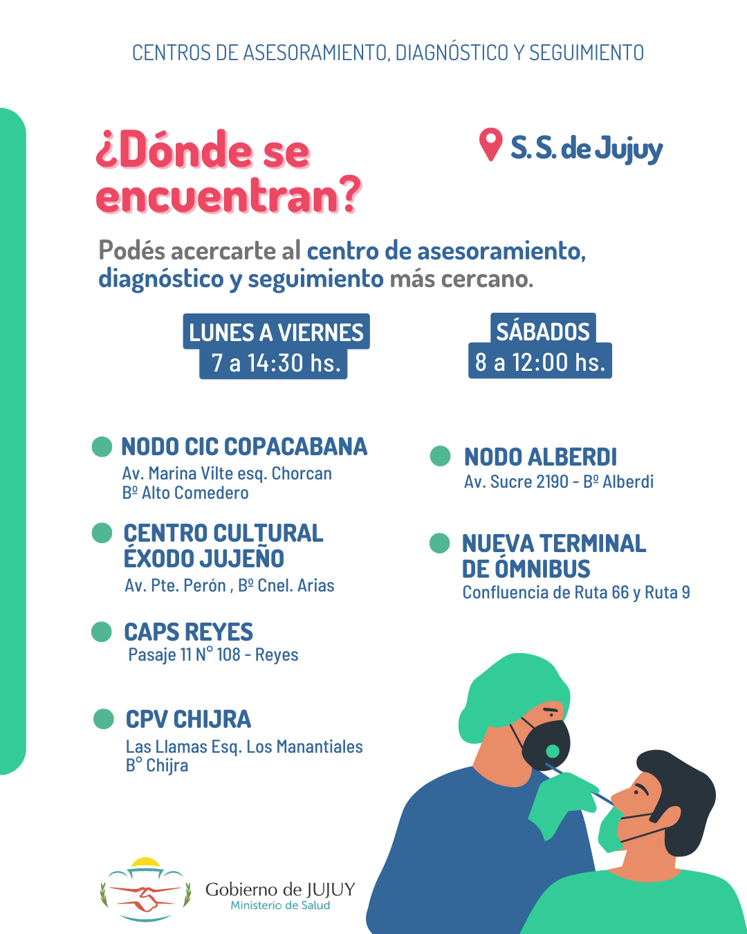 El Ministerio de Salud actualizó la información sobre los Centros de Asesoramiento, Diagnóstico y Seguimiento de pacientes Covid-19 en Jujuy.