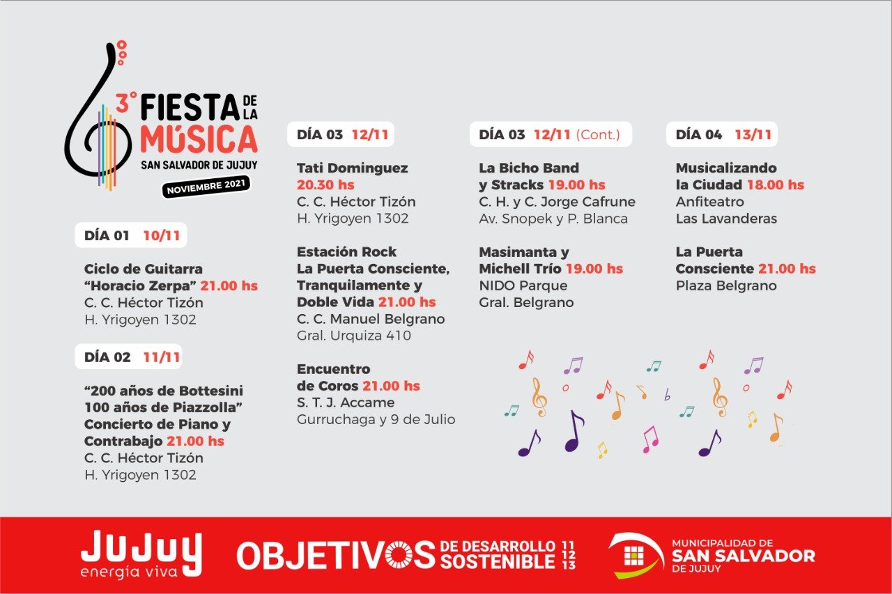-19 hs: 3° Fiesta de la música – Masimanta y Michell Trío en vivo, en NIDO Gral. Belgrano, Calle 250 Viv. ADEP Alto Comedero – San Salvador de Jujuy (evento libre y gratuito, llevar botellas de plástico limpias y secas)