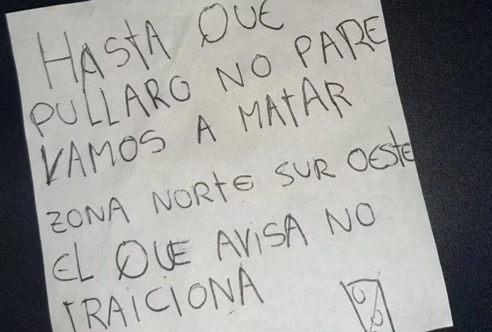 La nota fue hallada en la ciudad de Rosario, en donde advierte al Gobernador por una nueva escalada de violencia.“Hasta que Pullaro no pare, vamos a matar. El que avisa no traiciona”, indica el texto escrito en un papel a poca distancia del Policlínico PAMI 2, en medio de un operativo de Gendarmería Nacional.