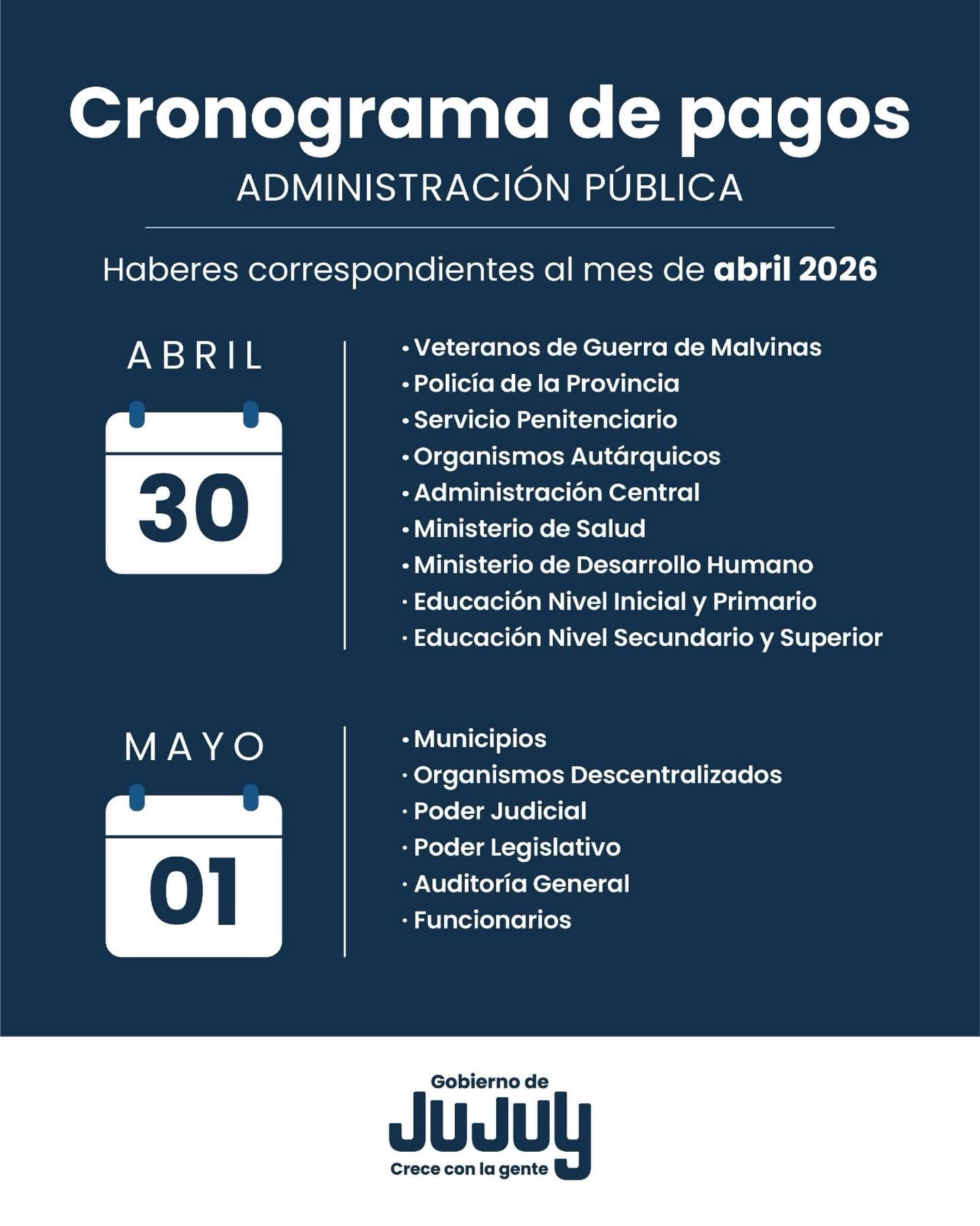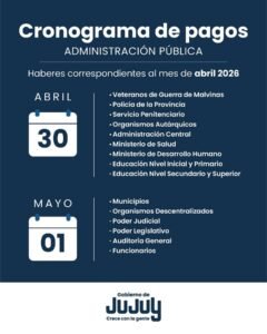 La Tesorería de la Provincia de Jujuy informó que el cronograma de pagos a la administración pública comenzará este jueves 30 de abril y se extenderá hasta el viernes 1 de mayo, completando en sólo dos jornadas la acreditación de los haberes a los agentes estatales.