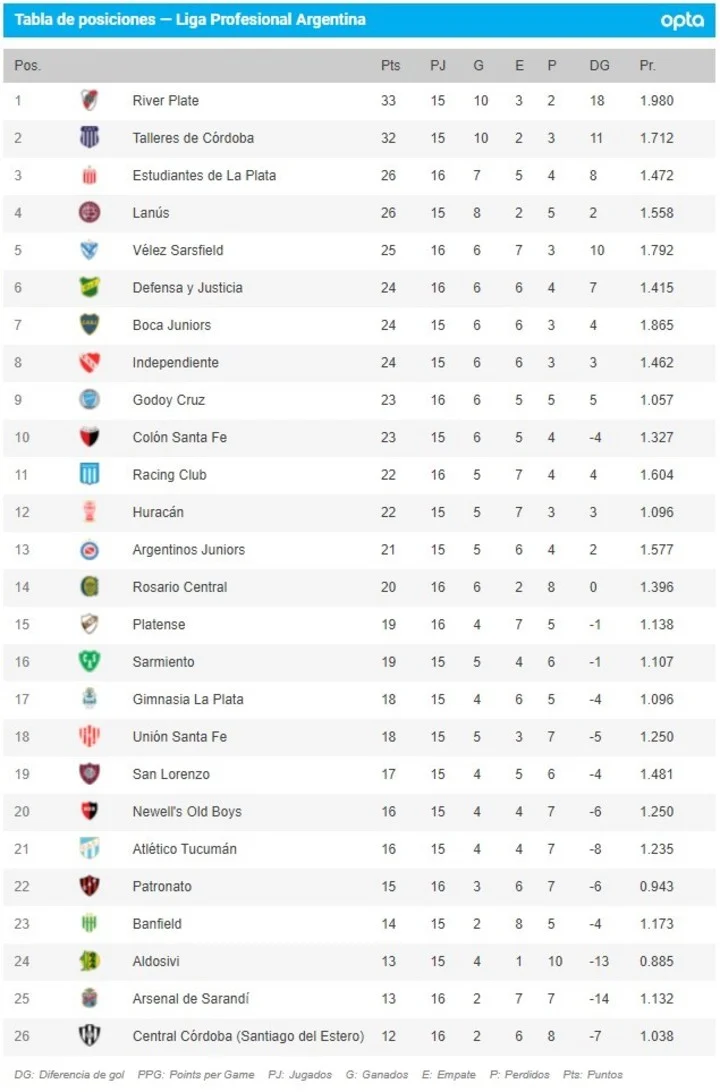 De esta manera, la Tabla de la Liga Profesional se confirmó de la siguiente manera.