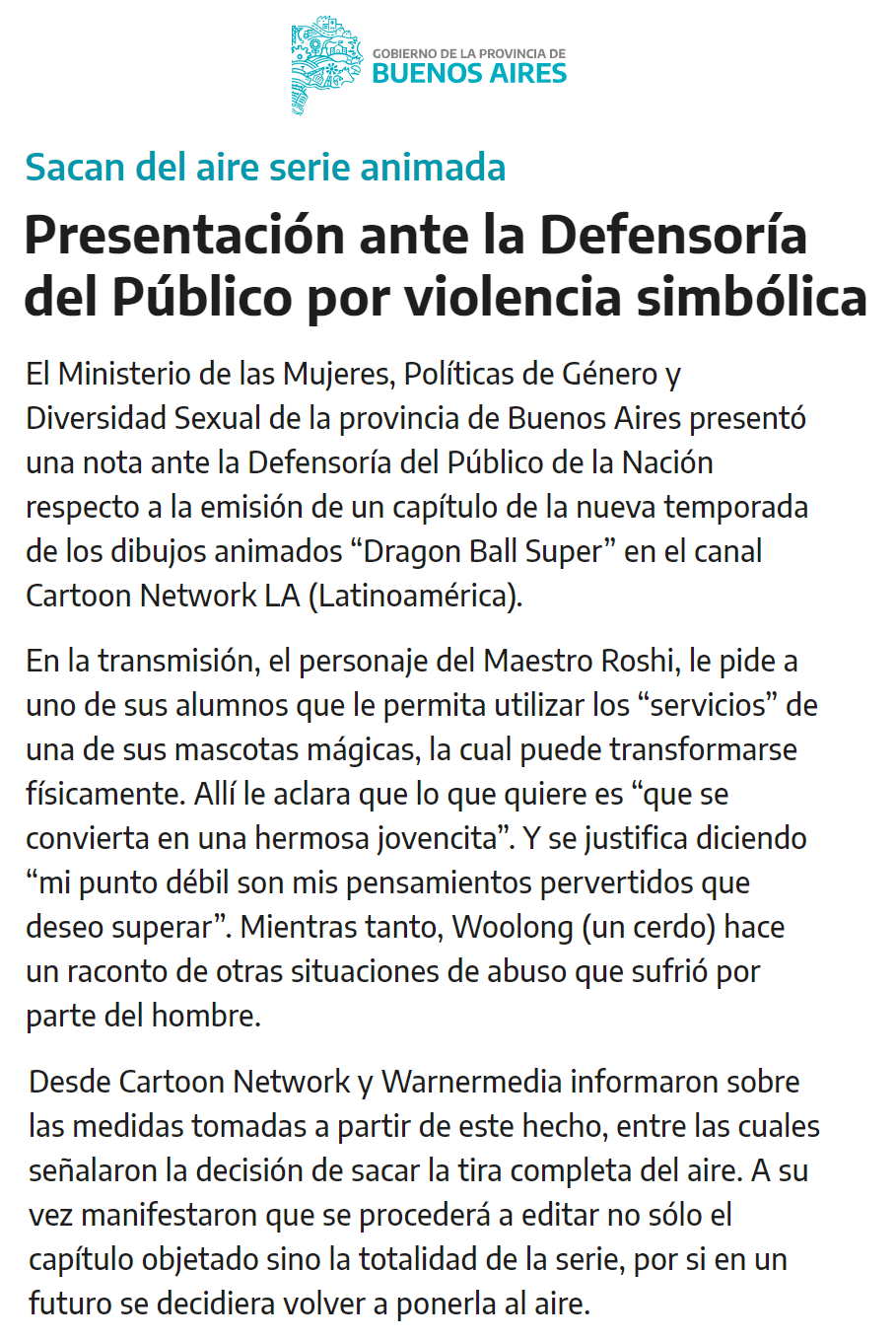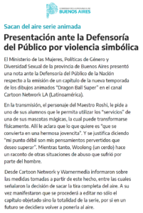 Ayer, el Ministerio de las Mujeres, Políticas de Género y Diversidad Sexual de la provincia de Buenos Aires realizó un comunicado de prensa donde presentó una denuncia por “violencia simbólica” en un episodio de la serie Dragon Ball Super, que se emite por Cartoon Network.