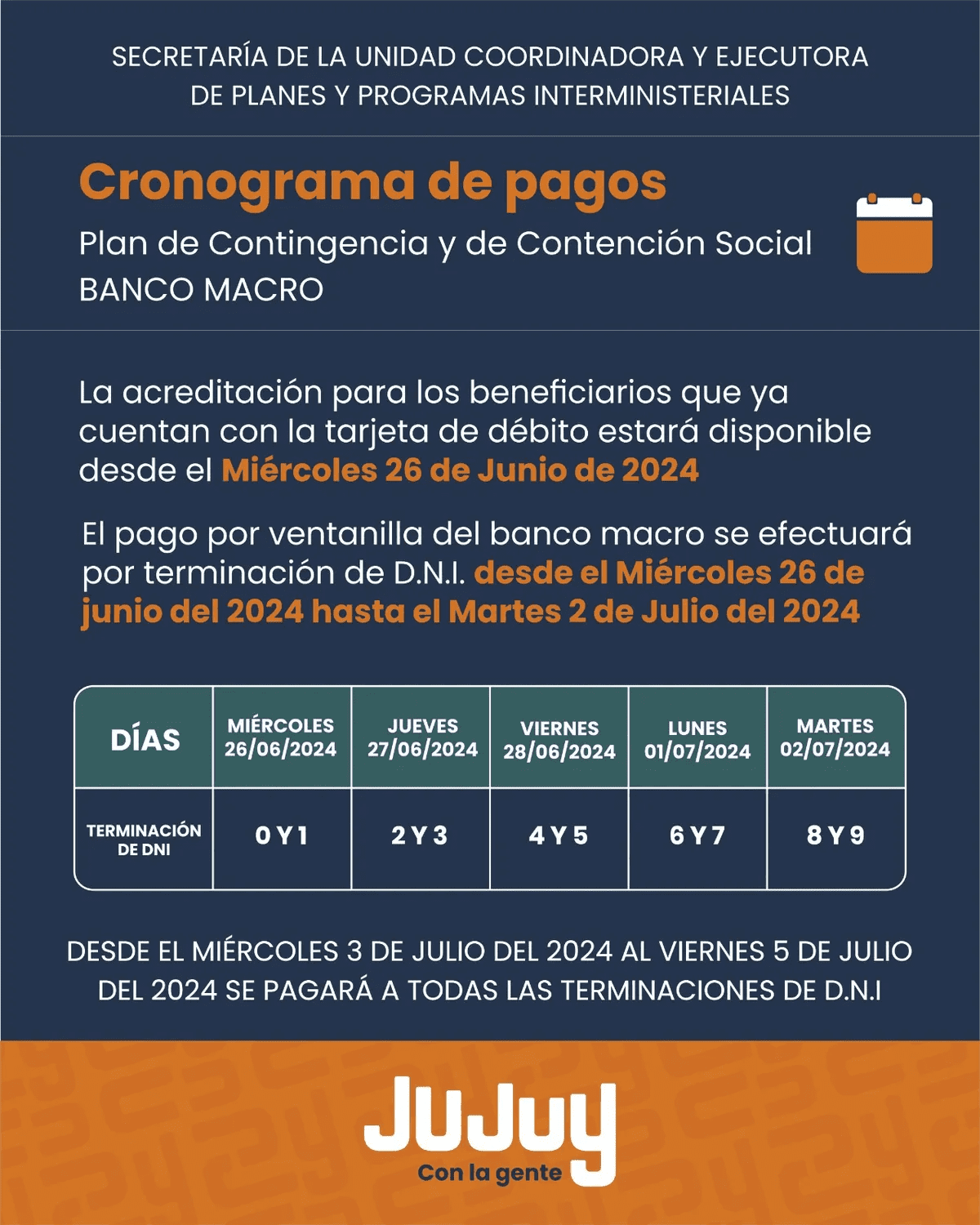La Secretaría de la Unidad Coordinadora y Ejecutora de Planes y Programas Interministeriales, informó que la acreditación del Plan de Contingencia a beneficiarios que ya cuentan con tarjeta de débito estará disponible desde el miércoles 26 de junio hasta el viernes 5 de julio del 2024.