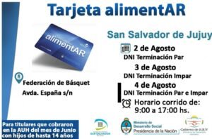 Esta semana se continuará con la entrega de entrega de Tarjetas AlimentAR en distintas localidades de la provincia de Jujuy, convocando a las y los titulares del beneficio para que acudan con su Documento Nacional de Identidad y para las y los titulares que cobraron en la Asignación Universal por Hijo del mes de junio con hijos/as de hasta 14 años.