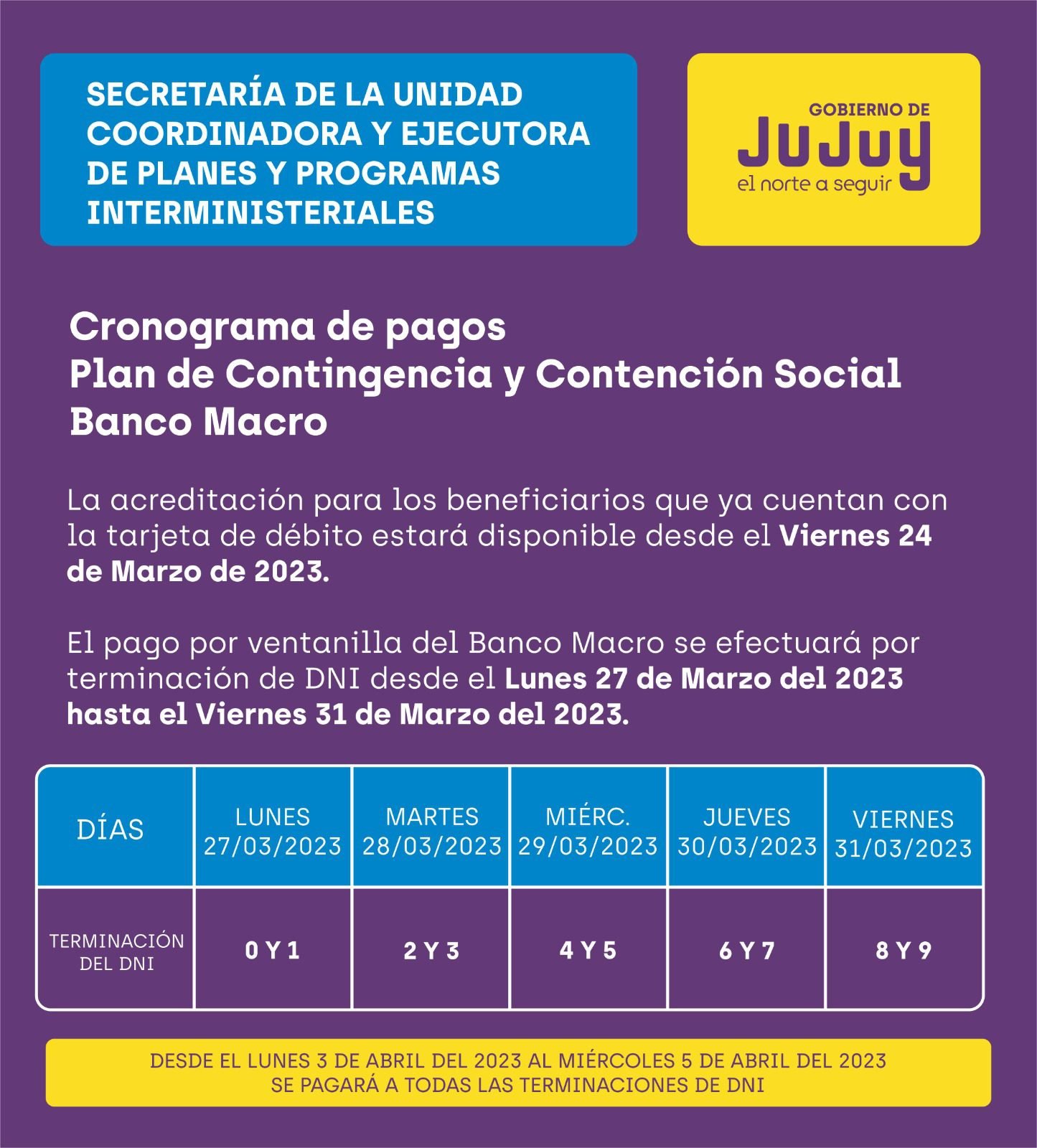 Cronograma de Pago del Plan de Contingencia. 24 marzo, 2023 Facebook Twitter WhatsApp Escuchar Artículo Desde la Secretaría de la Unidad Coordinadora y Ejecutadora de Pkanes Y Programas Interministeriales, dieron a conocer las fechas de cobro para los beneficiarios del Plan de Contingencia y Contensión Social Banco Macro. Facebook Twitter WhatsApp