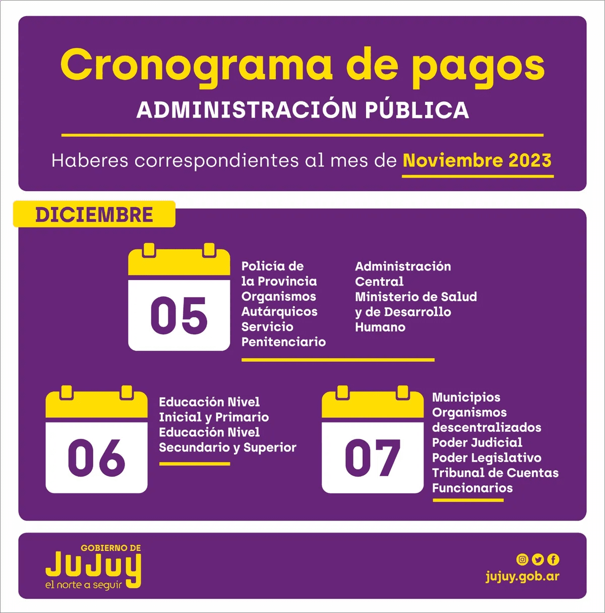 El Gobierno de la Provincia de Jujuy, informó el cronograma de pagos correspondiente al mes de noviembre de 2023 para el personal de la Administración Pública.