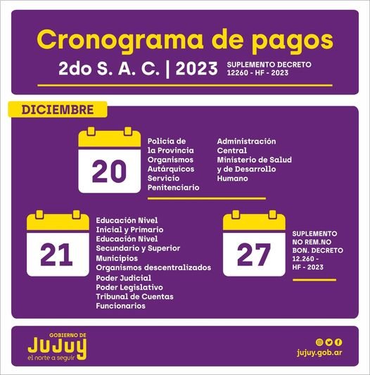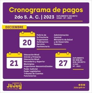 El Gobierno de la Provincia de Jujuy, informó el cronograma de pagos del Segundo S.A.C. del 2023 y el Bono de fin de año correspondiente al mes de diciembre para el personal de la Administración Pública.