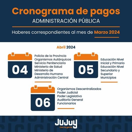 El Gobierno de la Provincia de Jujuy, informó el cronograma de pagos para el personal de la Administración Pública.