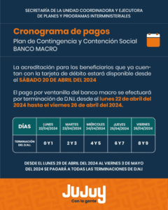 El Gobierno de la Provincia de Jujuy, dio a conocer las fechas de pago para quienes cobran el Plan de Contingencia con tarjeta y por ventanilla.