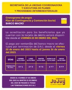 El Gobierno de Jujuy, mediante la Secretaría de la Unidad Coordinadora y Ejecutora de Planes y Programas Interministeriales, informó que la acreditación para los Beneficiarios que ya cuentan con la Tarjeta de Débito de Banco Macro, los montos estarán disponibles desde este viernes 20 de enero del 2.023.
