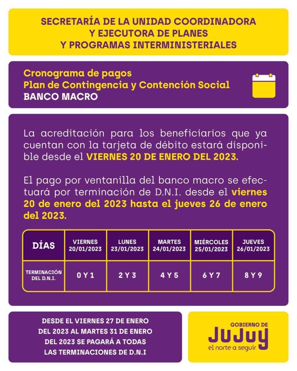 El Gobierno de Jujuy, mediante la Secretaría de la Unidad Coordinadora y Ejecutora de Planes y Programas Interministeriales, informó que la acreditación para los Beneficiarios que ya cuentan con la Tarjeta de Débito de Banco Macro, los montos estarán disponibles desde este viernes 20 de enero del 2.023.