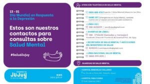 De modo que hoy, 13 de enero, se conmemora en todo el País, el Día Mundial en Respuesta a la Depresión, el Personal Sanitario de la Provincia ofrece a la comunidad, su servicio a disposición, en brindar información de calidad. Con el objetivo de fortalecer el acceso a la consulta Profesional, de manera gratuita, y puedan generar también una mayor empatía con la persona que necesita la atención Profesional, en todos sus entornos sociales.