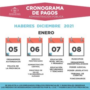 Tesorería de la Provincia dio a conocer el cronograma de pagos correspondiente al mes de diciembre del 2021. El mismo comenzará el 5 de enero del 2022 con Organismos Autárquicos y Policía de la Provincia.