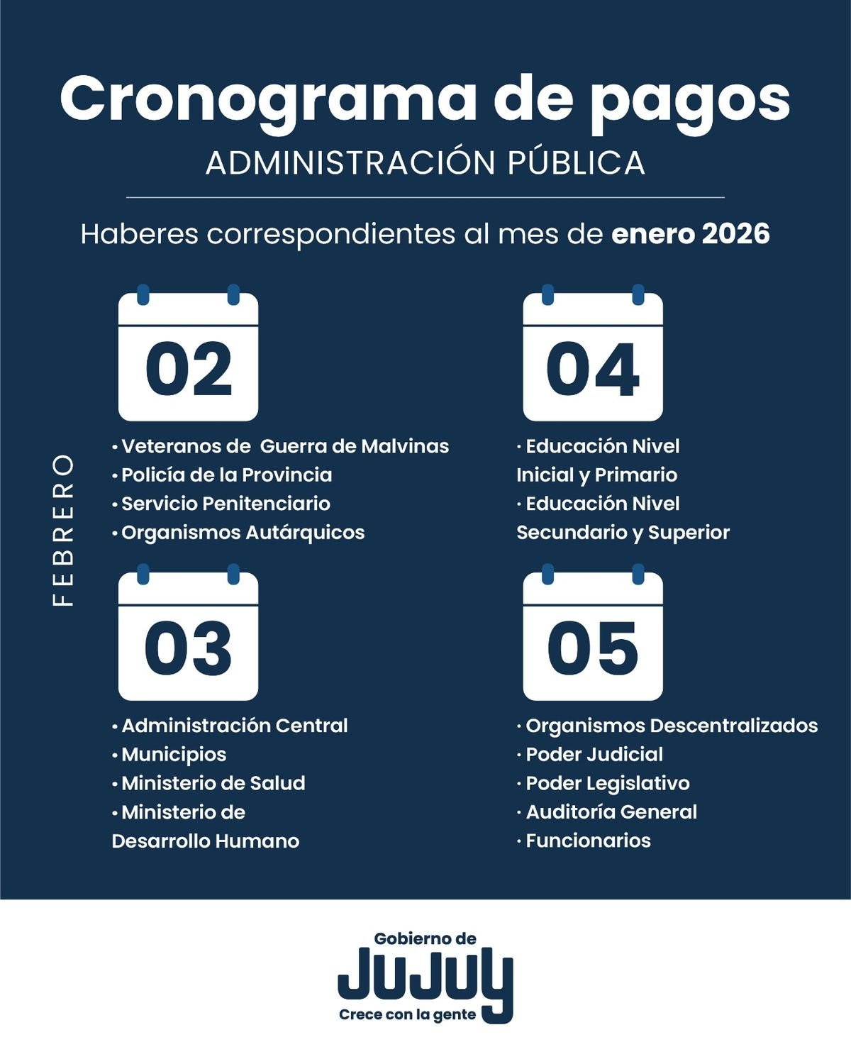 La Tesorería de la Provincia de Jujuy informó que el cronograma de pagos a la administración pública iniciará el lunes 2 de febrero y se extenderá hasta el jueves 5 de febrero.