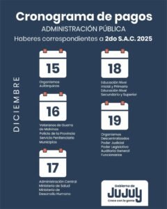 El Gobierno de Jujuy informó que el lunes 15 de diciembre se acreditará el pago del aguinaldo para la Administración Pública.