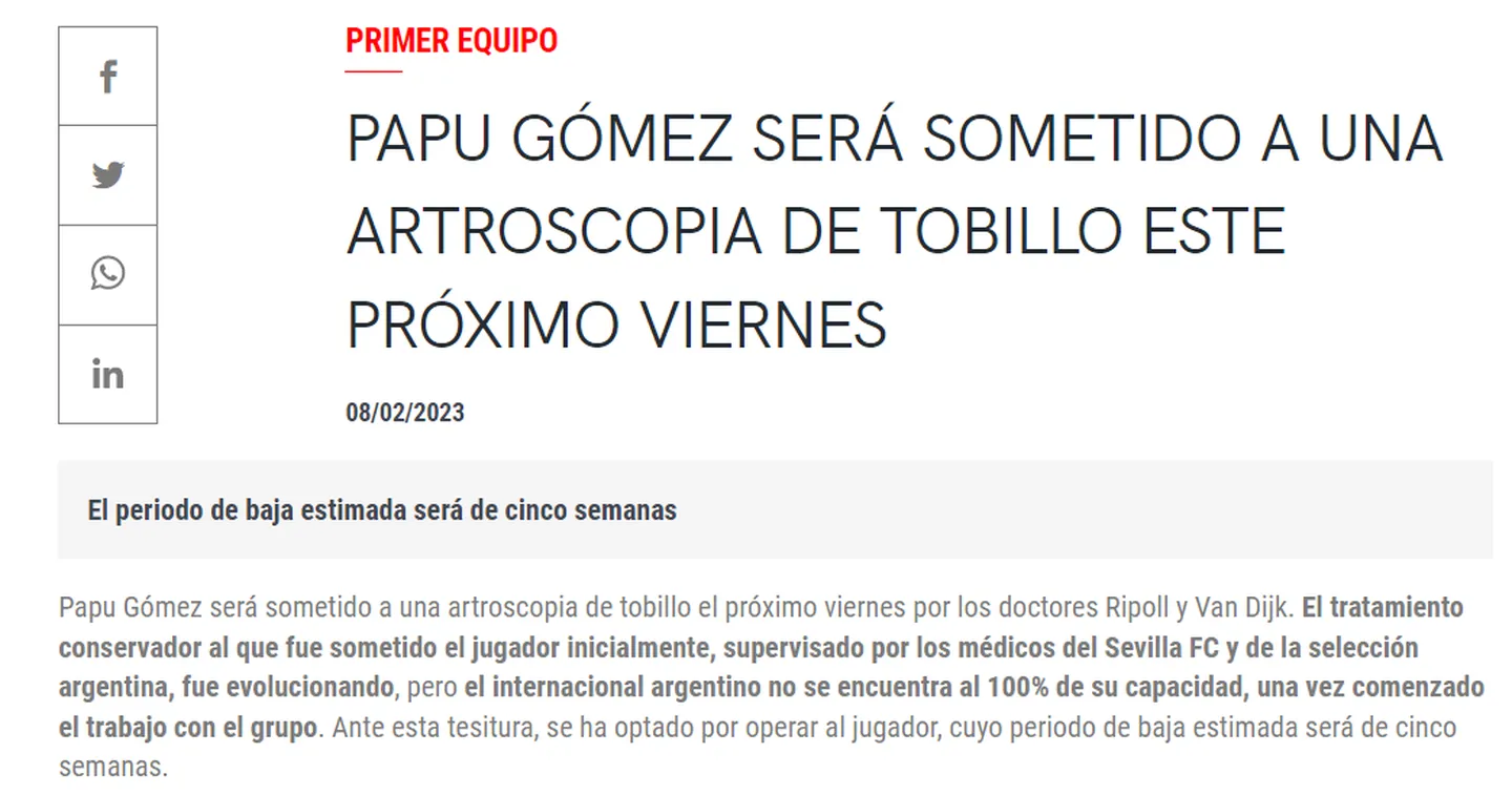 “Papu Gómez será sometido a una artroscopia de tobillo el próximo viernes por los doctores Ripoll y Van Dijk. El tratamiento conservador al que fue sometido el jugador inicialmente, supervisado por los médicos del Sevilla FC y de la selección argentina, fue evolucionando, pero el internacional argentino no se encuentra al 100% de su capacidad, una vez comenzado el trabajo con el grupo. Ante esta tesitura, se ha optado por operar al Jugador, cuyo periodo de baja estimada será de cinco semanas”.