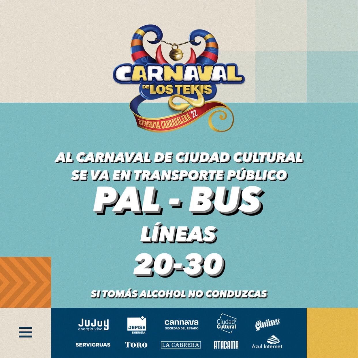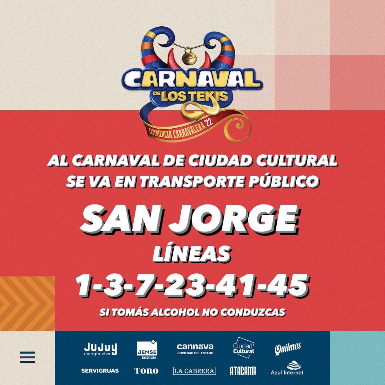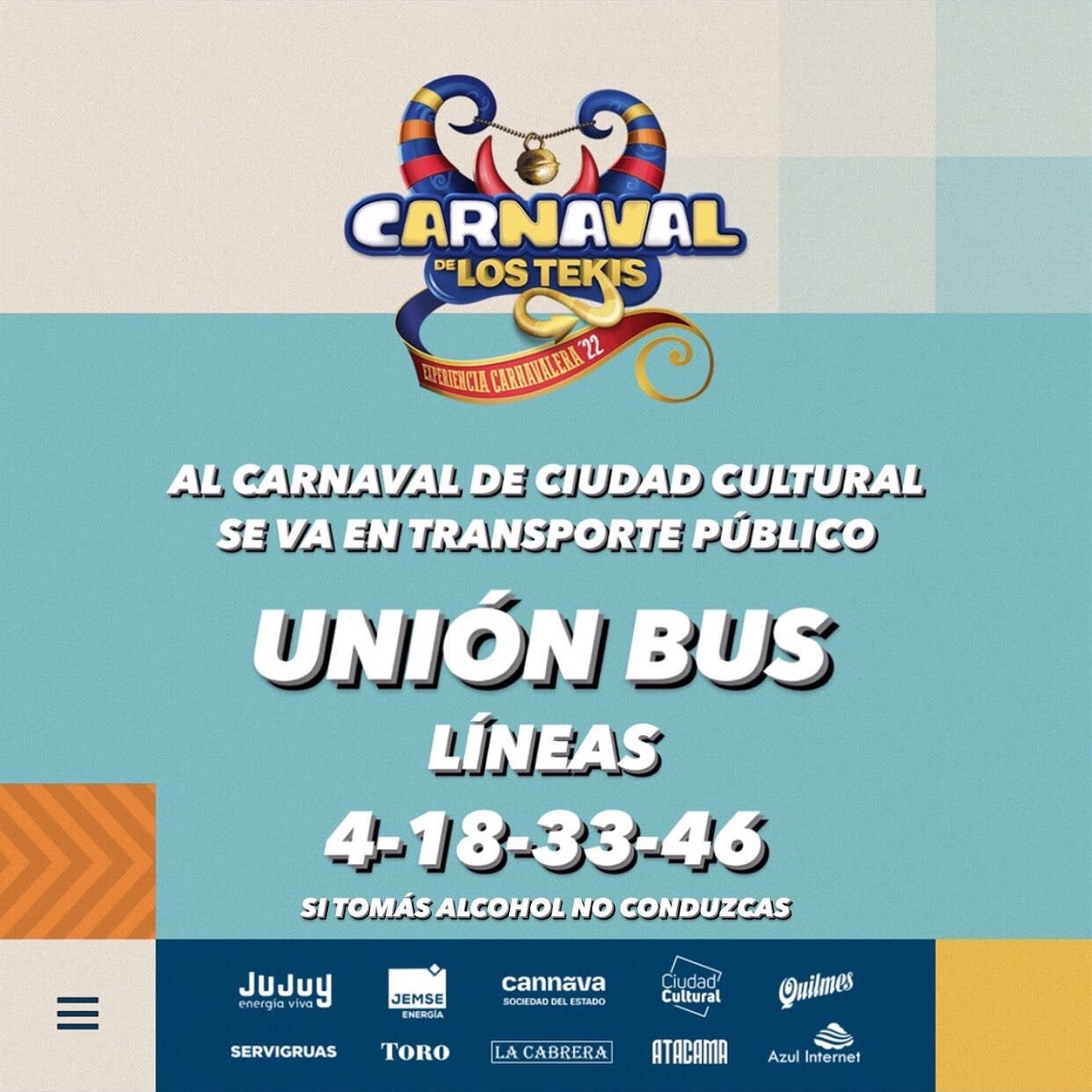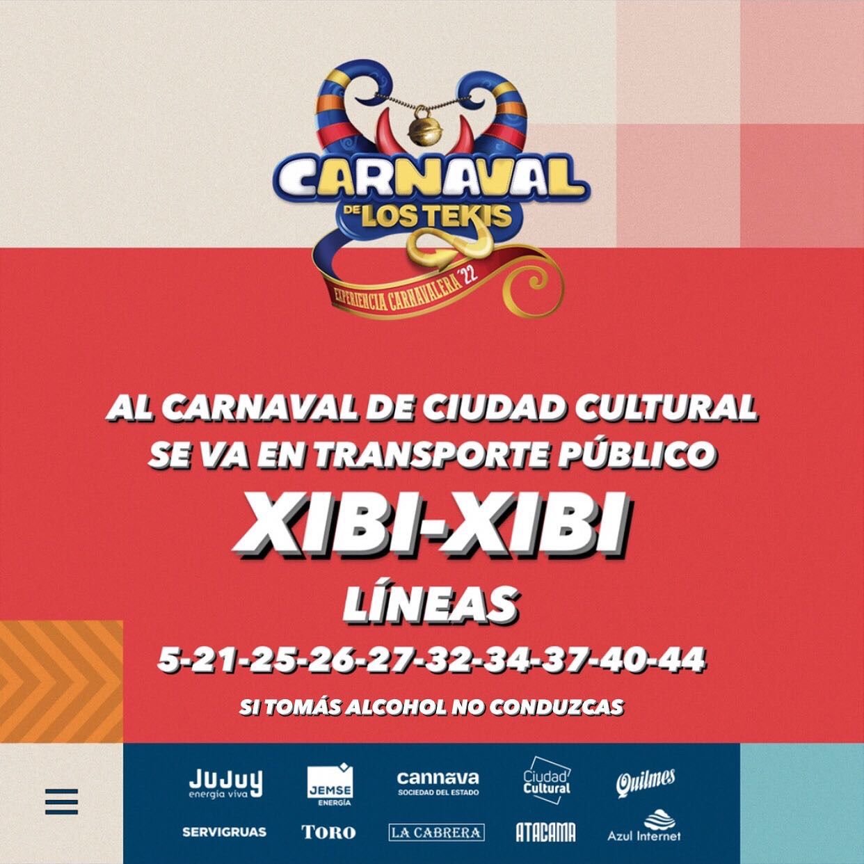 En razón de llevarse a cabo los días viernes 25, sábado 26, domingo 27 y lunes 28 de febrero, el tradicional “Carnaval de los Tekis” y “Carnavalódromo”, en Ciudad Cultural, se ha dispuesto que las líneas de transporte urbano de pasajeros afecten su recorrido llegando hasta el lugar del evento, donde se hallarán las paradas debidamente identificadas.