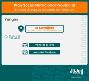 El Gobierno de Jujuy informó que se entregarán unidades alimentarias en La Mendieta, Rodeito y San Lucas.