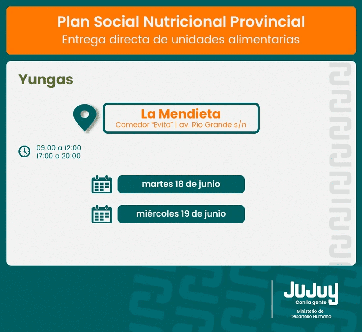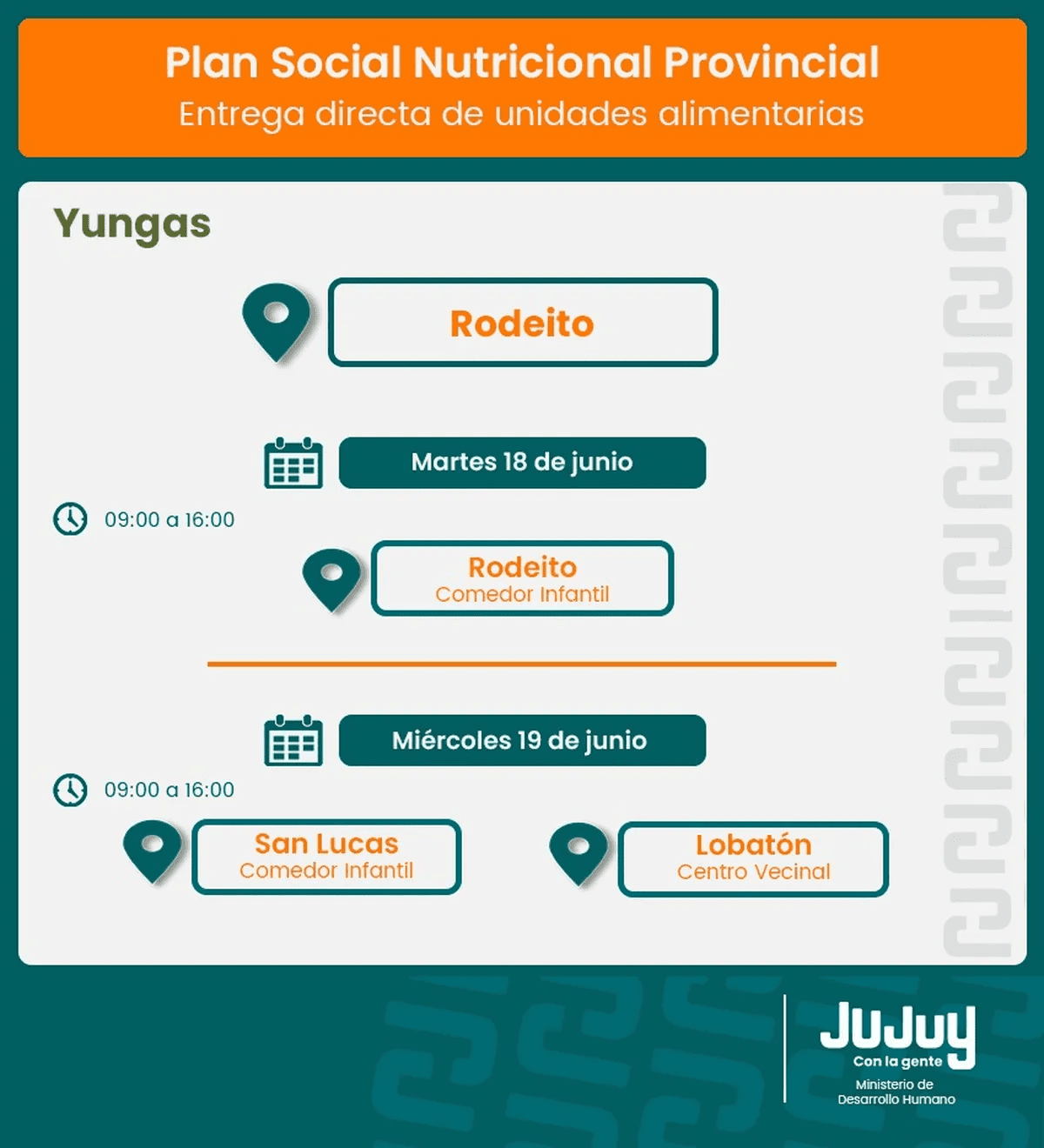 El Gobierno de Jujuy informó que se entregarán unidades alimentarias en La Mendieta, Rodeito y San Lucas.