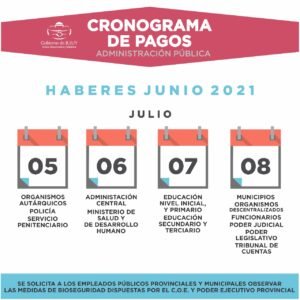 Este lunes inicia el cronograma de pagos para la administración publica 1 julio, 20217 julio, 2021 Facebook Twitter WhatsApp Escuchar Artículo Desde el próximo lunes 5 de julio se acreditaran los haberes correspondientes al mes de junio. Se solicita a los empleados públicos provinciales y municipales observar las medidas de bioseguridad dispuestas por el COE. Facebook Twitter WhatsApp