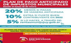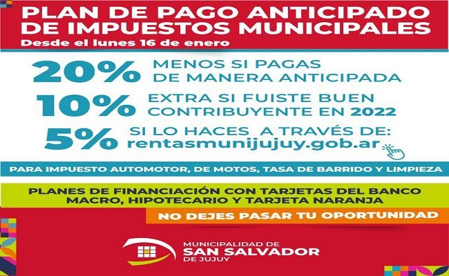 En este caso, para quienes fueron “Buen contribuyente” en el 2.022, van a acceder a un 30% de descuento. Para evitar aglomeraciones puede realizar el pago de manera Online, ingresando a rentasmunijujuy.gob.ar, sumando un 5% extra de descuento.