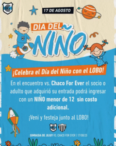 El domingo Gimnasia y Esgrima de Jujuy recibirá a Chaco For Ever por una nueva fecha del torneo, el club anunció que cada socio o adulto que adquiera su entrada podrá ingresar acompañado de un niño o niña de hasta 12 años, sin pagar ningún costo adicional.