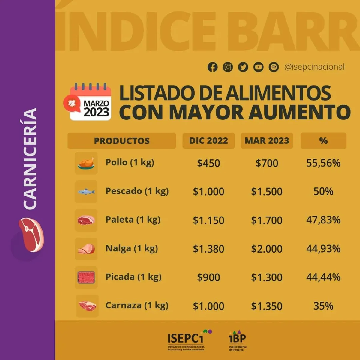 Un último informe del Instituto de Investigación Social, Económica y Política Ciudadana (ISEPCI), los productos de carnicería registraron grandes incrementos; ya que, la carne vacuna pasó de $1.380 a $2.000, el pollo de $450 a $700 y el pescado de $1.000 a $1.500.