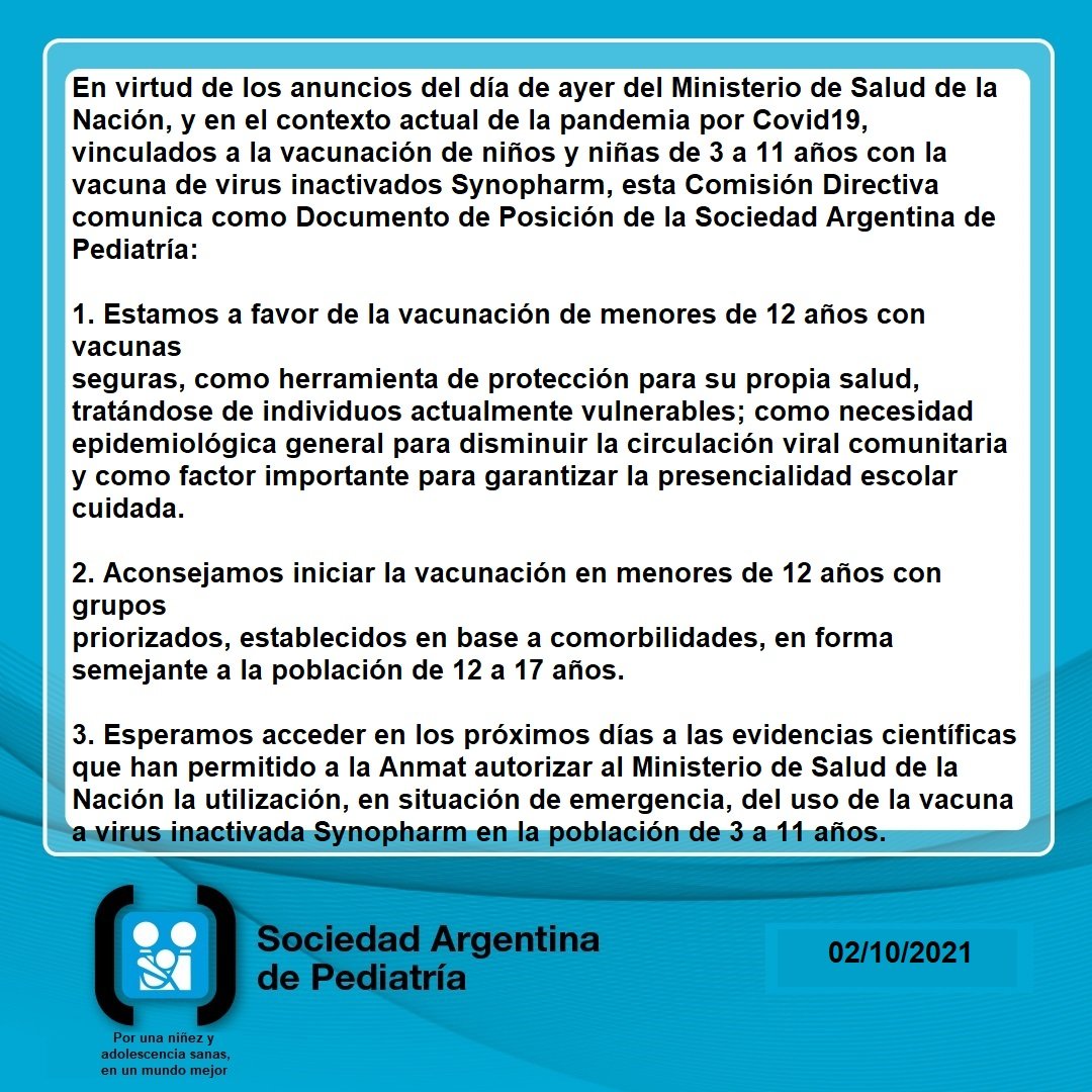 «Esperamos acceder en los próximos días a las evidencias científicas que han permitido a la Anmat autorizar al Ministerio de Salud de la Nación la utilización, en situación de emergencia, del uso de la vacuna a virus inactivada Synopharm en la población de 3 a 11 años», expresó la entidad en un comunicado interno a los socios al que tuvo acceso NA.