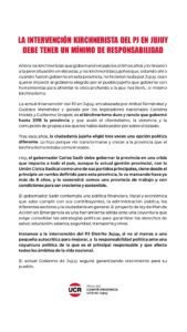 Finalmente, la UCR, expresó que: “Instamos a la intervención del PJ Distrito Jujuy, si no al menos a una pequeña autocrítica para mejorar, a la responsabilidad política ante una coyuntura política de la que es el principal responsable y que afecta todos los ámbitos de la vida nacional”.