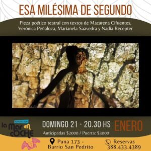 Además, desde el multiespacio invitaron a la comunidad a ver la obra poética teatral “Esa milésima de segundo”, de la autora Marianela Saavedra, que se estrenará este domingo 21 de enero a las 20:30 hs.