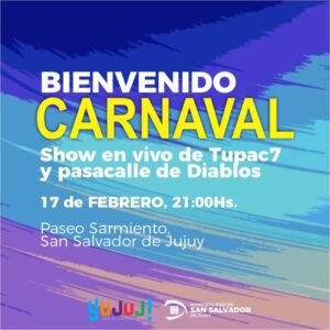 En el Evento, vamos a tener un show en vivo del grupo Tupac 7 y un pasacalle con diablos y algo de lo que es el típico folclore Jujeño en esta época de Carnaval; así que a todos los turistas, las turistas y a los vecinos que se quieran llegar para vivir un lindo momento en el Paseo Sarmiento, pueden acercarse este viernes, a partir de las 21 horas y también para que disfruten el Carnaval con todos los cuidados.