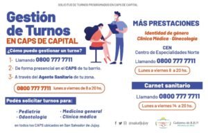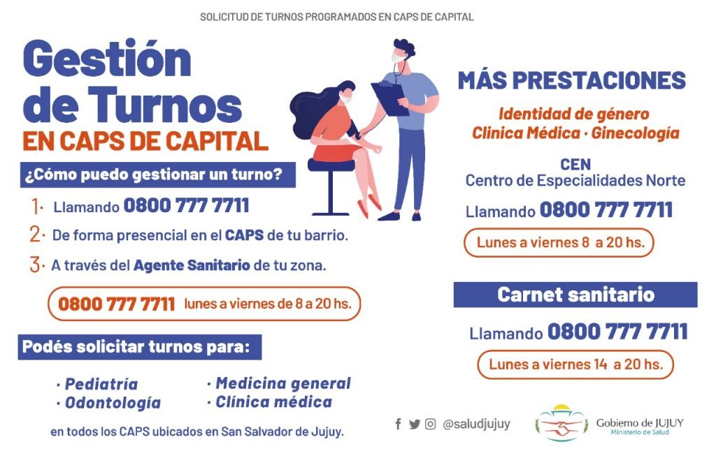 El Ministerio de Salud de Jujuy informó que la nueva estrategia inició esta semana permitiendo a la población de la capital jujeña tres opciones para solicitar turnos en pediatría, odontología, medicina general y clínica médica en los Centros de Atención Primaria de la Salud (CAPS): a través de la Unidad Call Center, personalmente en el CAPS o bien al agente sanitario durante la visita al domicilio.