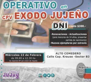 Desde el Registro Civil Provincial informaron que el “Operativo DNI” estará funcionando en el Sector del CVP Éxodo Jujeño; sobre la calle Capitán Krause – Sector B3. Será este miércoles 22 de febrero a partir de las 9am hasta las 12:30.