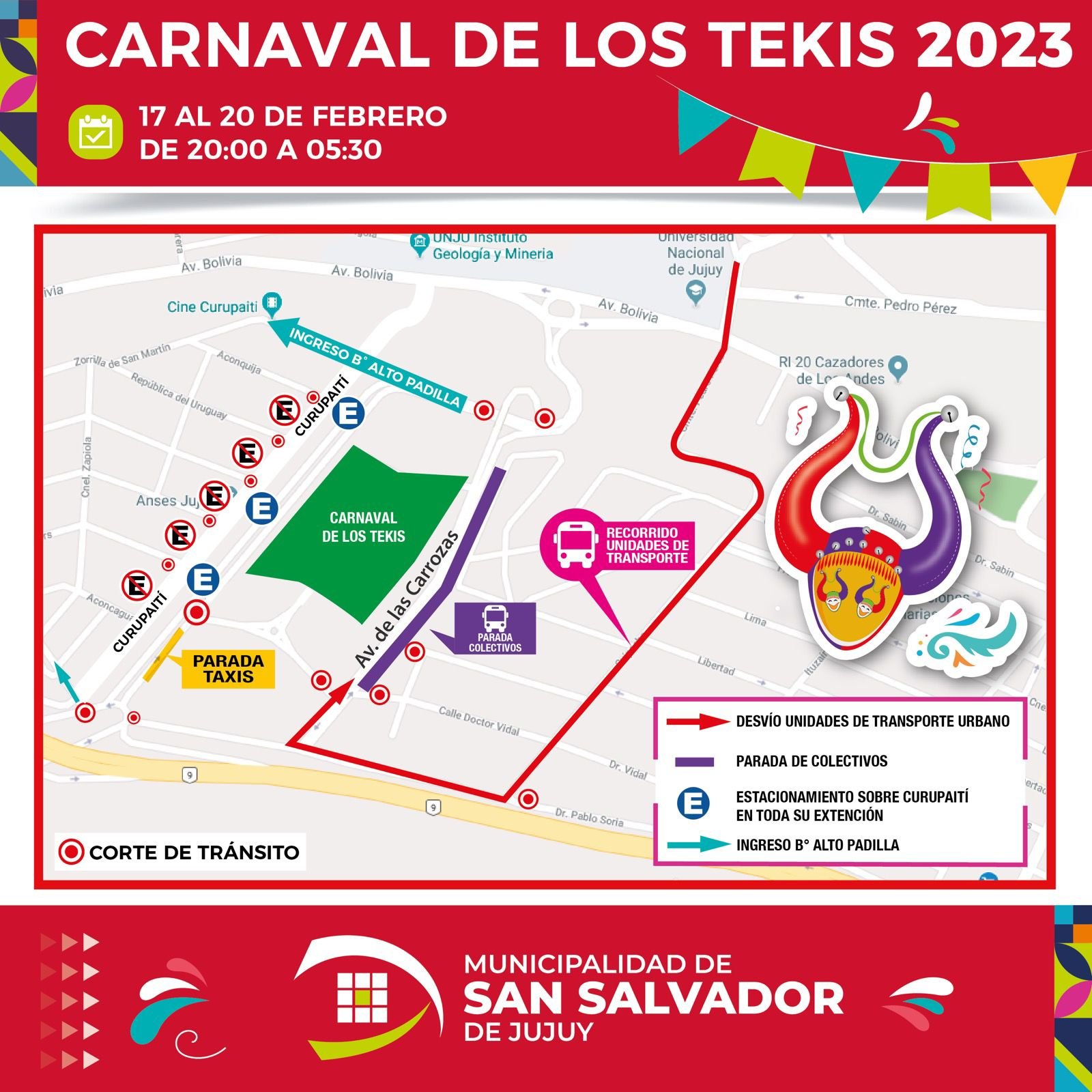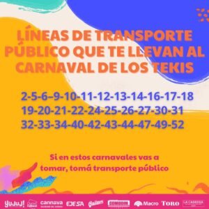 Que hay que saber para ir al Carnaval de los Tekis 17 febrero, 2023 Facebook Twitter WhatsApp Escuchar Artículo Destacando que la Fiesta de los Tekis empieza hoy, estas son cuestiones que necesitas tener en cuenta: Recorridos de colectivos: Consejos Carnavaleros: Facebook Twitter WhatsApp