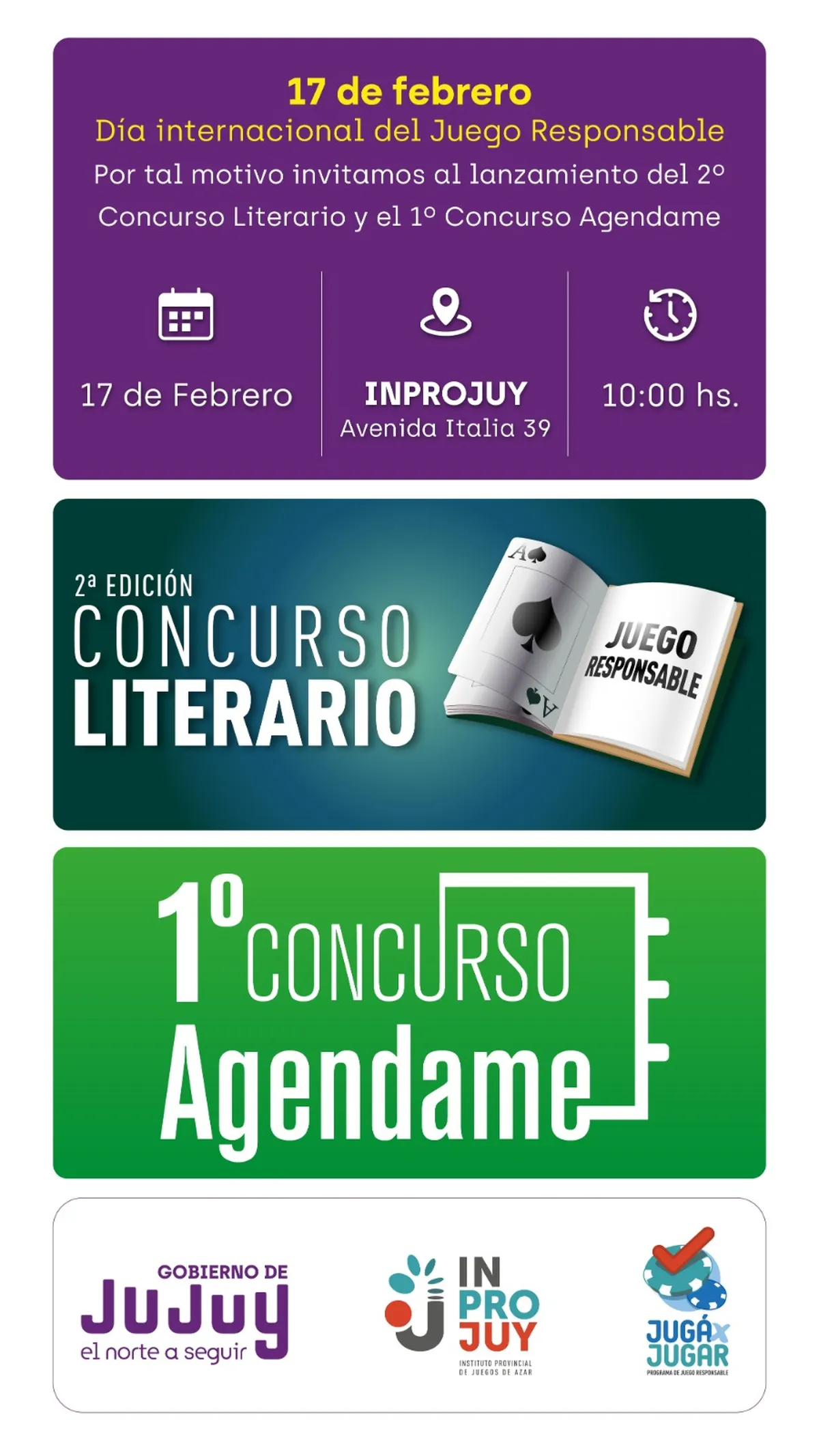 - “Agéndame”: Es un concurso donde se participa respondiendo preguntas por WhatsApp que giran en torno al Juego Responsable; con la intención de informar y que les quede agendado el número por cualquier consulta que tengan sobre esta temática. Las bases y condiciones estarán en nuestra web. www.inprojuy.gob.ar