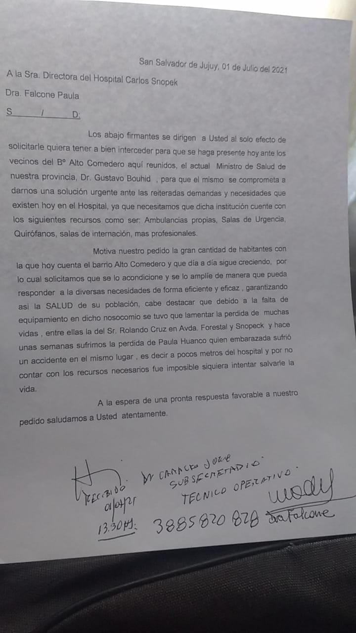 El día de ayer volvieron a convocarse vecinos del barrio alto comedero en la puerta del hospital Carlos Snopek cansados de no obtener respuestas a las demandas que hace tiempo vienen sosteniendo.