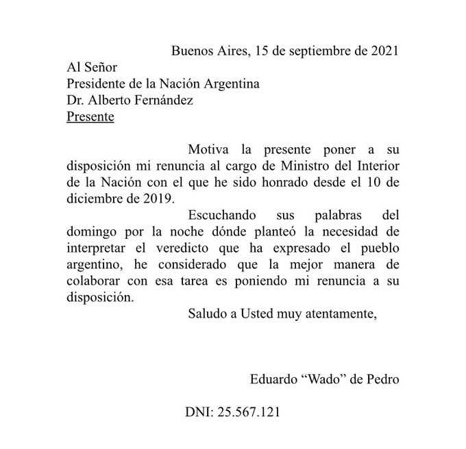«Escuchando sus palabras del domingo por la noche dónde planteó la necesidad de interpretar el veredicto que ha expresado el pueblo argentino, he considerado que la mejor manera de colaborar con esa tarea es poniendo mi renuncia a su disposición».