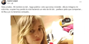 “Hola a todos. Mi nombre es Lali. Hago público esto que estoy viviendo. Ella es Milagros, mi sobrinita, quien hoy, (por el viernes pasado), perdió la vida haciendo un reto de TikTok. Por favor pido que compartan. Mi familia y yo no tenemos consuelo”; publicó la mujer junto con una foto de la menor.