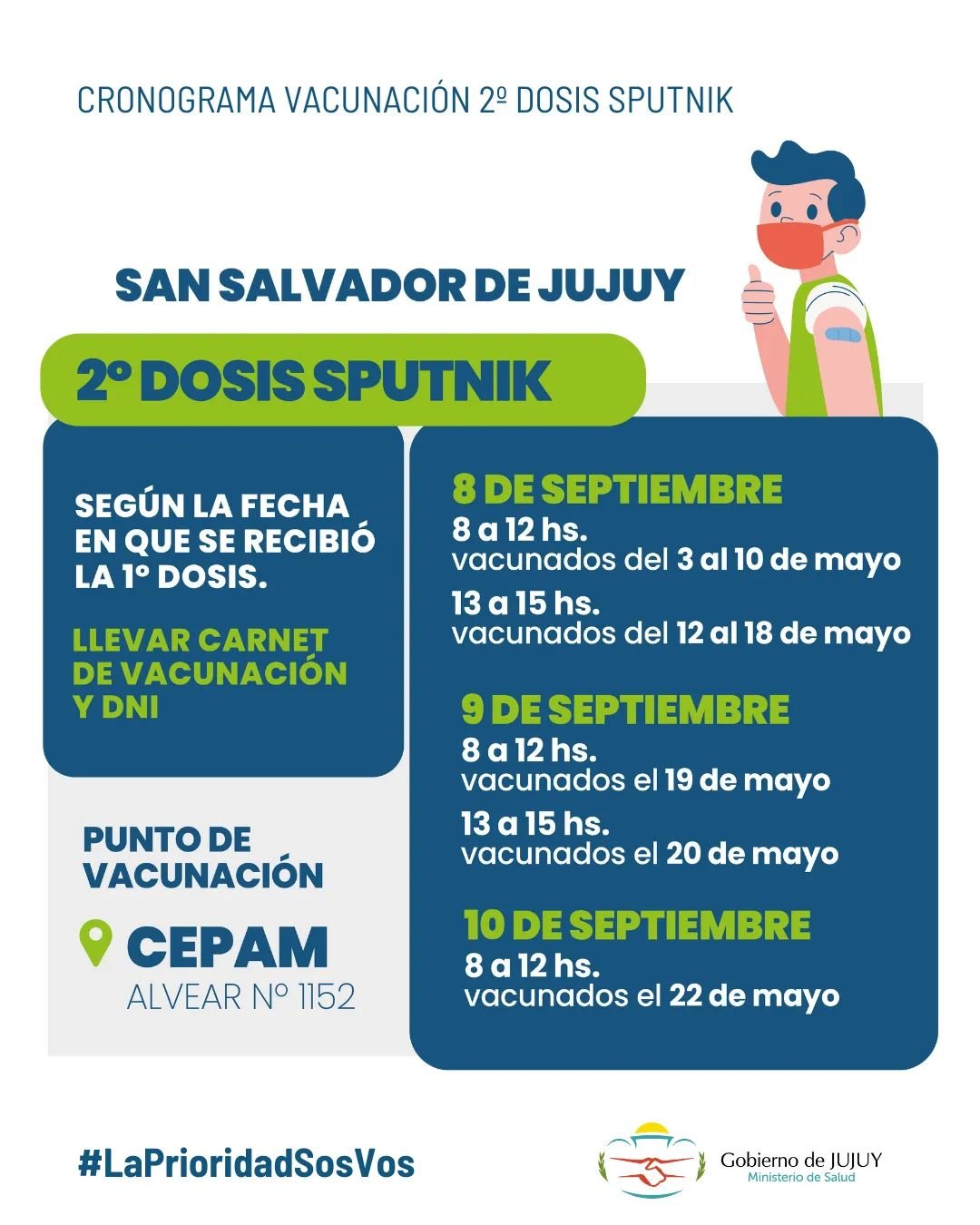 El Ministerio de Salud de Jujuy, a través de la Mesa de Vacunas, informó que a partir de este miércoles se dará continuidad a la vacunación en respuesta al Covid-19 con segunda dosis de Sputnik-V, de acuerdo a un estricto cronograma en el que ya no será requisito la notificación por correo electrónico o WhatsApp sino la fecha en que se recibió primera dosis, consignada en el respectivo carnet que se deberá presentar junto al DNI.