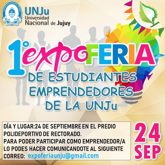 La Universidad Nacional de Jujuy (UNJU) invita a toda la comunidad universitaria y público en general a participar de la 1ra. Expo Feria de Estudiantes Emprendedores de la UNJU, a desarrollarse el 24 de septiembre, de 10 a 19 horas, en el Polideportivo de Rectorado, ubicado en Av. Bolivia 1239 de barrio Los Huaicos.