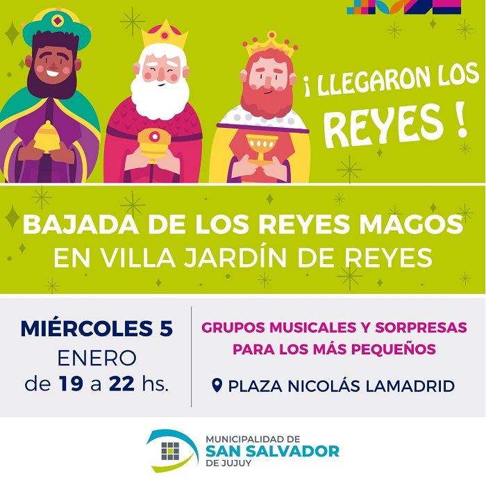 En vísperas al Día de los Reyes Magos, Melchor, Gaspar y Baltazar van a visitar a los más pequeños de Villa Jardín de Reyes para saludar y alegrar la ilusión esperada en estas fiestas. La tradicional bajada de los Reyes inicia a las 19 hs. en Termas de Reyes hasta llegar a Los Molinos. En tanto, en la Plaza “Nicolás Lamadrid”, la familia podrá disfrutar de espectáculos musicales.