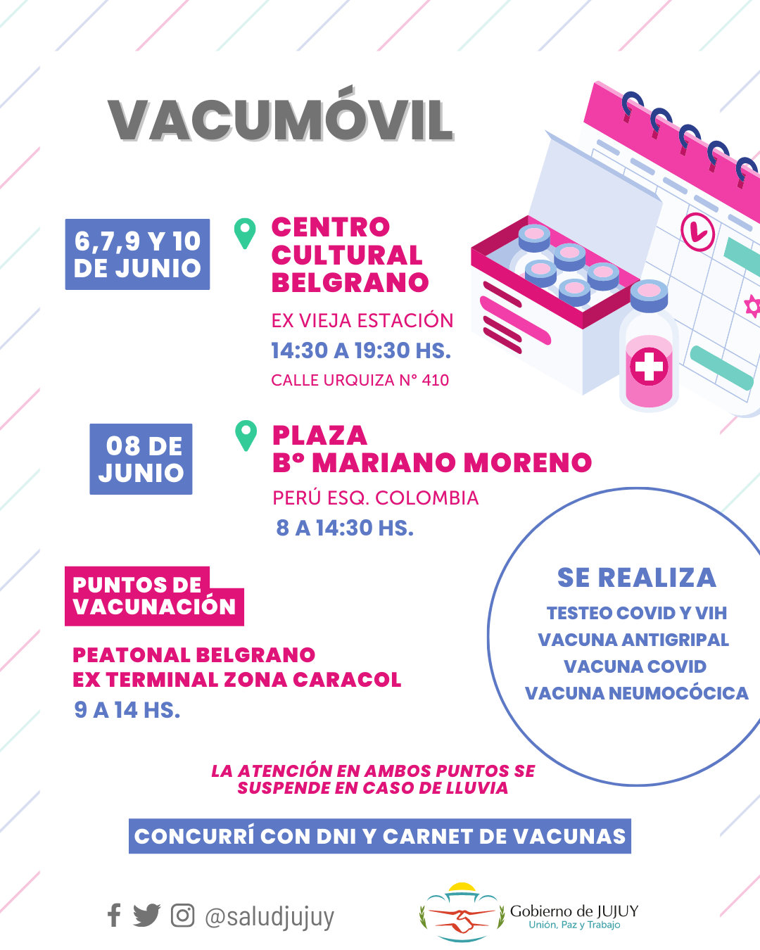 El Ministerio de Salud de la provincia dio a conocer el cronograma del VacuMóvil en donde indica cuál será el recorrido esta semana por San Salvador de Jujuy.