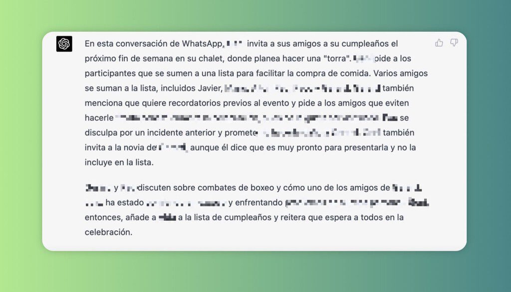Finalmente, desde la Aplicación, destacaron que, cualquier cosa dicha en ese grupo, por un pacto tácito, jamás será lo demasiado grave, confidencial o incriminatoria como para que alguien no quiera transferirlo a los servidores de OpenAI. Además, es una nueva posibilidad de aplicar cambios en bloque.